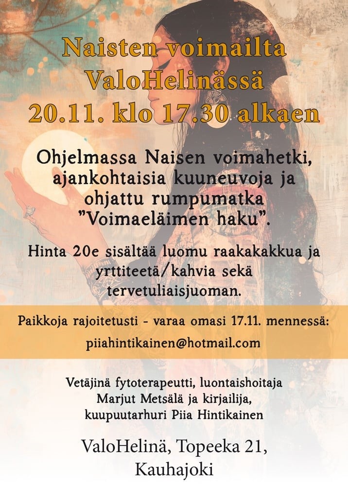 20.11. 2025 Naisten voimailta. Ohjelmassa naisten voimahetki, ajankohtaisia kuuneuvoja ja ohjattu rumpumatka voimaeläimen hakuun. hinta 20 €. Ilmoittaudu: valo.helina@gmail.com